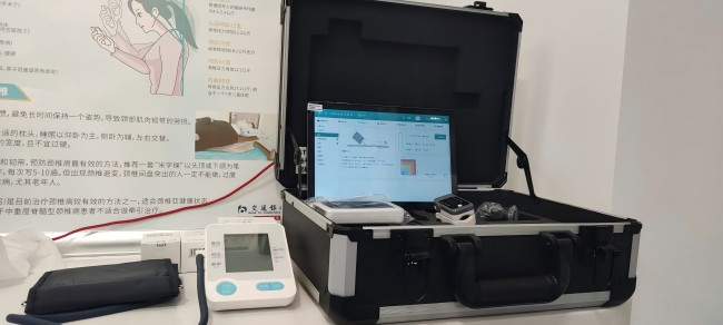 除了SH-T17智能健康一體機,健康中心也配置了SH-202便攜式健康一體機,SH-202便攜式健康體檢一體機是上禾針對基層公衛推出的一款便攜式公共衛生檢測設備,可以通過平板電腦等數據采集終端和數據管理軟件系統實現一體化整合,實現心電圖、心率、血糖、血壓、血氧飽和度、尿常規、體溫等多種參數檢測,快速建立居民電子健康檔案,與信息管理平臺或健康檔案管理系統進行數據交互傳輸,可上傳或成批次/單獨下載調用數據,并提供接口開發包,支持將采集到的健康數據上傳至區域信息平臺或健康檔案管理系統。