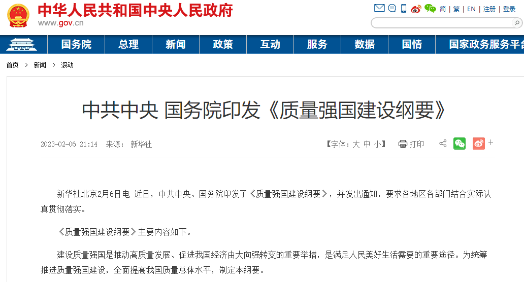 近日,中共中央、國務(wù)院印發(fā)了《質(zhì)量強(qiáng)國建設(shè)綱要》,并發(fā)出通知,要求各地區(qū)各部門結(jié)合實(shí)際認(rèn)真貫徹落實(shí)。